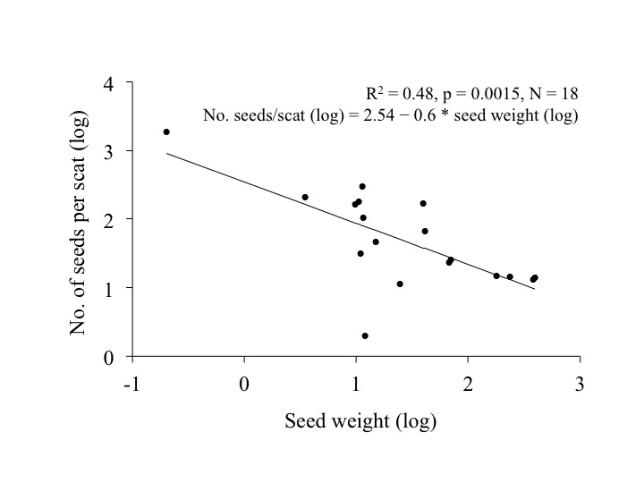 Seed dispersal by animals influences plant recruitment depending on the number of dispersed seeds, the treatment given to seeds in gut, and the germination and seedling survival in sites where seeds are dropped in the field. Seed dispersal by carnivores influences plant recruitment in temperate and tropical ecosystems. However, data on seed dispersal by carnivores in tropical drylands are limited. In these ecosystems, plants produce large numbers of fruits that may be eaten by carnivores, yet we ignore whether seed dispersal potentially influences plant recruitment. Hence, we investigated seed dispersal, seed germination after gut passage, and seed deposition of plants eaten by carnivores in the Tehuacán-Cuicatlán Valley. We collected scats to quantify the number of seeds per scat, percentage of damaged seeds per scat, and number of scats in the field. We also examined the relationship between seed number and seed weight, and compared the germination between seeds removed from fruits and scats in laboratory experiments. We found seeds from 18 plant species in scats collected in the field. Scats had an average of 133 seeds and 0.3% of damaged seeds. Seed number was negatively related to seed weight. Scats were dropped more frequently than expected in open areas and less frequently than expected in rocky and canopy areas. Gut passage had positive effects on germination in two species, neutral effects in six species, and negative effects in four species. Our data showed that carnivore scats had large numbers of viable seeds and gut passage increases seed germination or allows seed transportation to particular sites in fourteen species. However, gut passage decreases germination in four species. These results suggest that seed dispersal by carnivores potentially influences plant recruitment in the Tehuacán-Cuicatlán Valley.Descargas