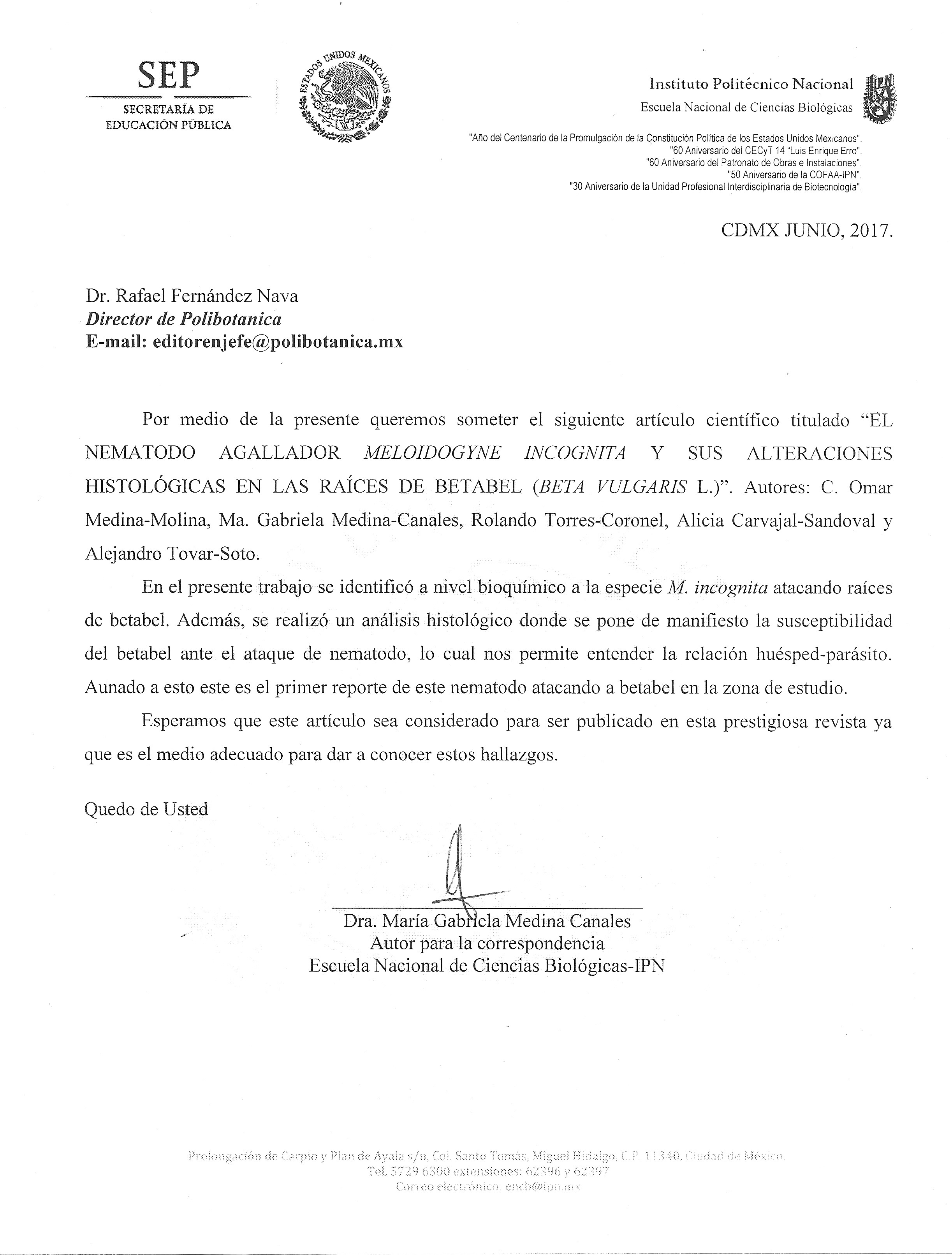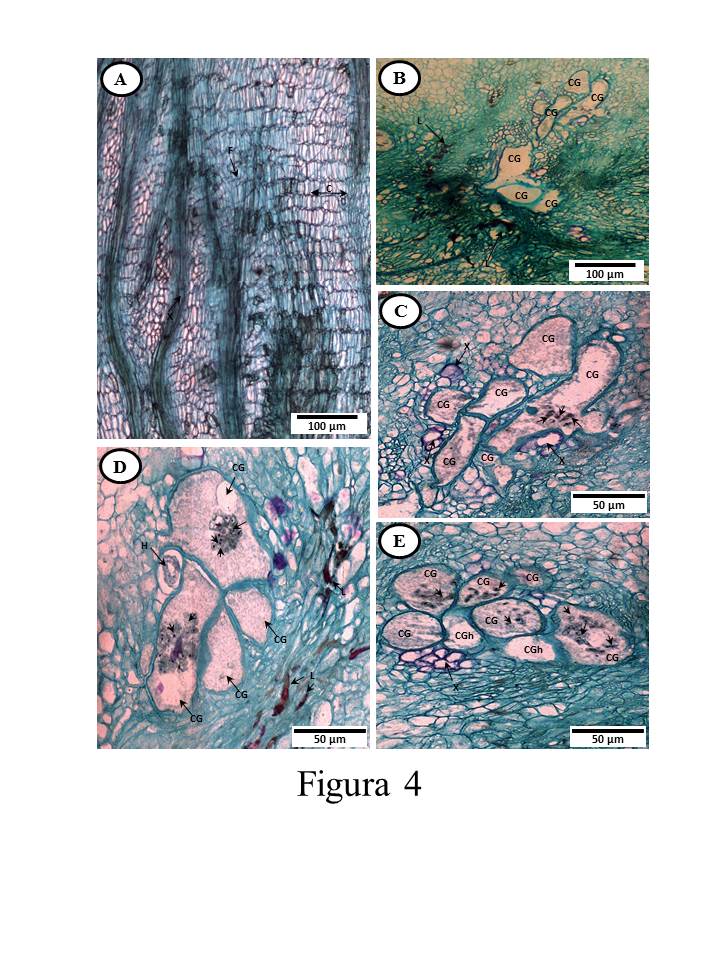 En México, se desconoce la especie de Meloidogyne asociada a betabel en el Valle de Tepeaca, Puebla; así como las alteraciones histológicas que este nematodo induce en las raíces de esta hortaliza. El objetivo del estudio fue identificar la especie de Meloidogyne asociada a betabel; así como describir las alteraciones histológicas inducidas por este nematodo en las raíces de betabel. En el 2011 se efectuó una exploración nematológica a la zona agrícola del Valle de Tepeaca en el estado de Puebla, en donde se encontró una parcela sembrada con betabel en la localidad de Santa María Actipa, municipio de Acatzingo, Puebla, México, se encontró que un alto porcentaje de las raíces presentaron agallas prominentes. En dicha parcela se tomó una muestra conformada por suelo (2.0-2.5 kg) y 10 plantas con y 10 sin agallas, mismas que se colocaron en una bolsa de polietileno de 40 × 40 cm lo que conformó la muestra representativa. La identificación del nematodo se llevó a cabo por la prueba de fenotipos isoenzimáticos utilizando las enzimas esterasa (EST) y malato deshidrogenasa (MDH) y confirmada por caracteres morfológicos de los patrones perineales de hembras. Para describir las alteraciones histológicas, las plantas con y sin agallas se fijaron con FAA y luego se incluyeron en parafina. Después se hicieron cortes de 9-10 µm de espesor en el plano longitudinal y transversal, éstos se tiñeron con fucsina-verde rápido. Los resultados mostraron que el fenotipo isoenzimático para EST correspondió al tipo I1; mientras que para MDH fue el fenotipo N2a ambos correspondientes a la especie Meloidogyne incognita. Así mismo, los patrones perineales de hembras mostraron arco dorsal alto y cuadrado, sin líneas laterales claramente visibles. Estos resultados corroboran la identificación de la especie Meloidogyne incognita asociada a betabel. Por su parte, el estudio histológico mostró hiperplasia e hipertrofia celular que provocó la formación de cinco a siete células gigantes multinucleadas, con 14-17 núcleos hipertrofiados, con paredes celulares engrosadas y citoplasma denso y granuloso. También se observaron cuatro a seis hembras piriformes por agalla, embebidas en el tejido parenquimatoso, con disposición cercana al cilindro vascular. La presencia de estas hembras provocó el reacomodo de los vasos xilemáticos y lignificación de células aledañas.Referencias