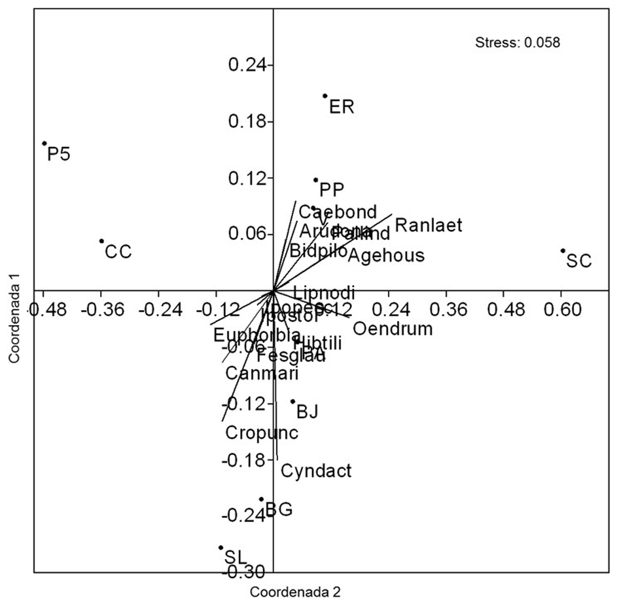 - Figura 4. Diagrama de escala multidimensional no paramétrico (NMDS) de los diez sitios basado en similitud de Bray Curtis.