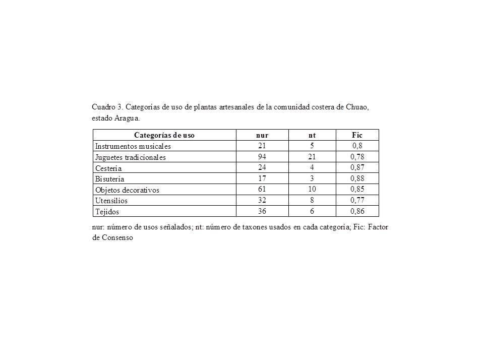 plantas artesanales, etnobotánica cuantitativa, costa de Venezuela.Resumen
