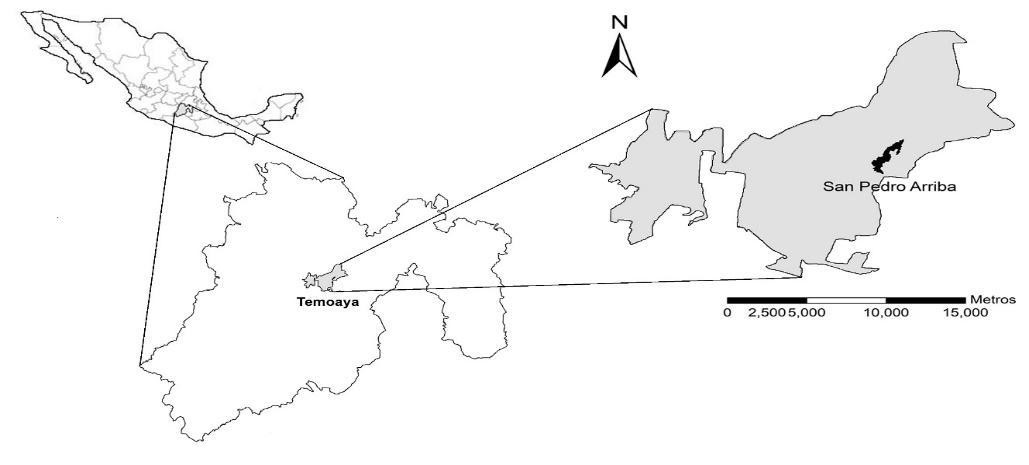 - Figura 1. Ubicación del municipio de Temoaya y localidad de estudio en el Estado de México, México (INEGI, 2009: Clave geodésica 15087).